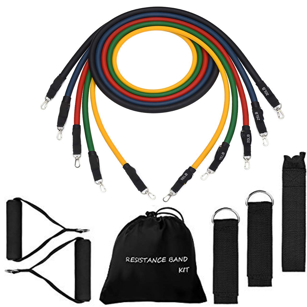 Odolandのトレーニングチューブセットには、負荷の違うループバンド(4.5~18kgまで)が4本とチューブ(2.3〜11.4kg)が5本入っています。