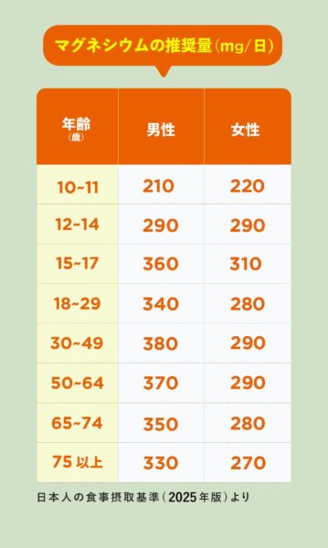 1日に必要なマグネシウムの摂取量は、年代・性別によって推奨量が定められています。