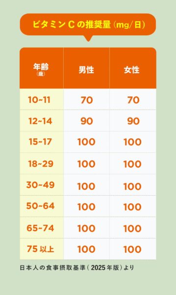 1日に必要なビタミンCの摂取量は、年代・性別により推奨量が定められています。