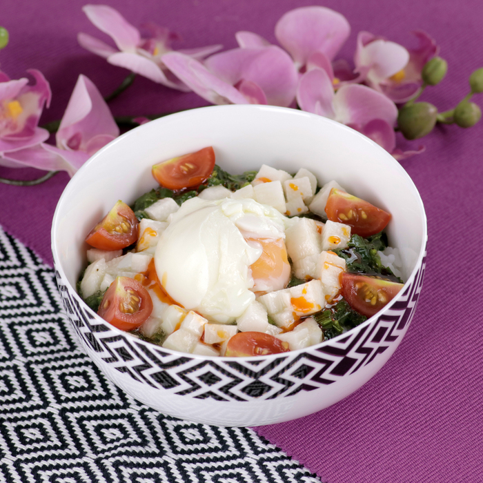 器にご飯を盛り、4、ながいも、温泉卵、トマトを盛り付ける。全体を混ぜ合わせて召し上がってください。*お好みで、ラー油をかけて召し上がってください。