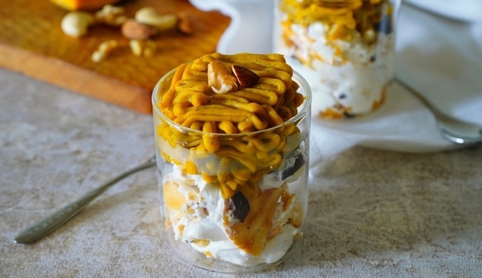 器に3を入れたら、端を1カ所小さく切った食料保存袋(ジップロックなど)に2を入れて、生クリームの上に絞り出すようにして乗せる。仕上げにお好みのナッツをトッピングする