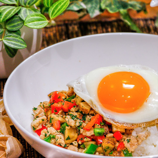 器にご飯を盛り、3をかけて4の目玉焼きをのせる。