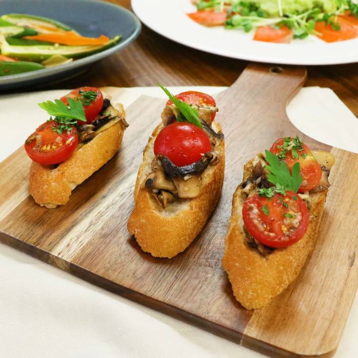 マッシュルームは汚れを落とし薄切りにする。にんにくはみじん切りにする。ミニトマトは縦半分に切る。