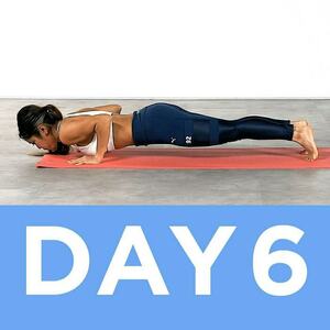 プログラムの後半は少しハードになってきます。腕の筋肉を使って、全身を鍛えるエクササイズです。2日目と同じくお腹を引き締めながら行うので、コアを鍛えるトレーニングとしても効果が期待できます。