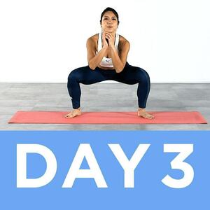 最後は下半身のシェイプアップとコア部の引き締め効果が期待できるエクササイズです。バランスを崩さないようお腹を引き締めながら行うので少しキツいですが、しっかり腰を落とすことでじんわりと下半身の筋肉に効いてきます。