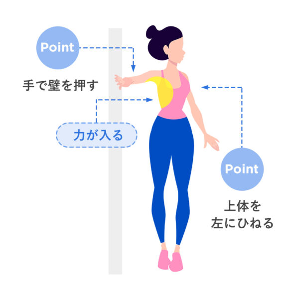 2上体を壁と反対側にひねり、壁にあてている手を押す