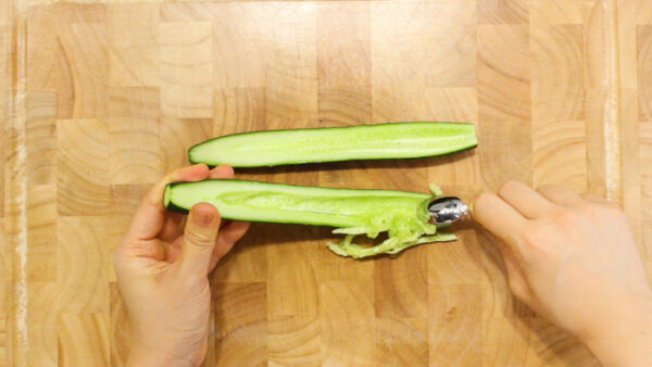 1.きゅうりは縦半分に切って種をのぞき、4〜5cmの長さに切って食べやすい大きさに切る。