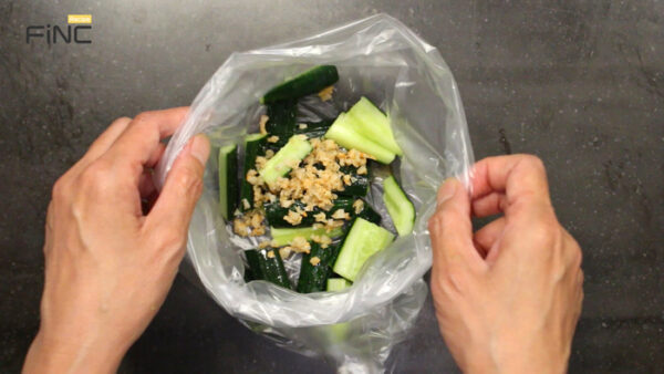 3.ビニール袋に1、2、ごま油、塩を加えて揉む。