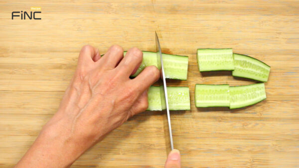 2.きゅうりは縦半分、4cmの長さに切り、種を除く。