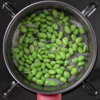 鍋にかつおだし、薄切りにしたたまねぎを入れて5分くらい煮たら、枝豆を加えて1分ほど煮る。