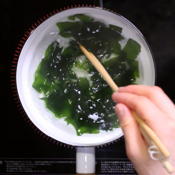 生わかめは洗って水に戻し、一口大に切る。沸かしたお湯の中にさっとくぐらせ、水につけて色止めをする。