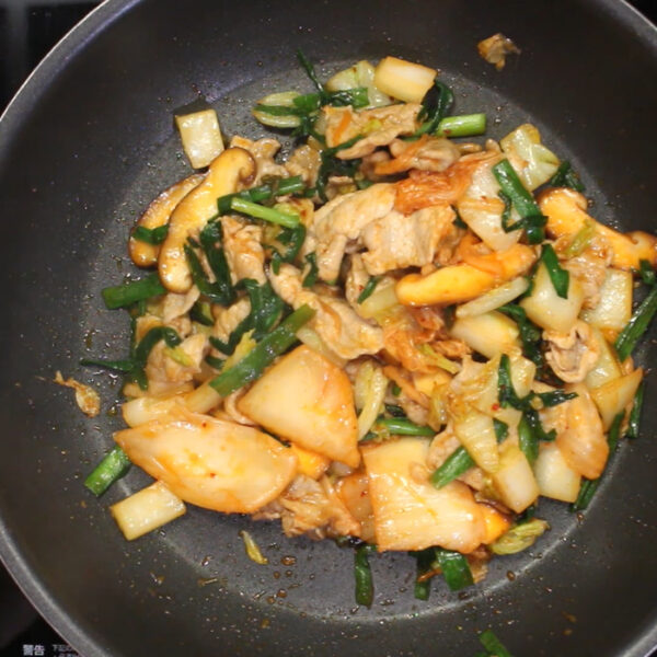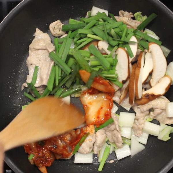 白菜がしんなりしてきたら、しいたけ、にら、キムチを加えさらに炒める。