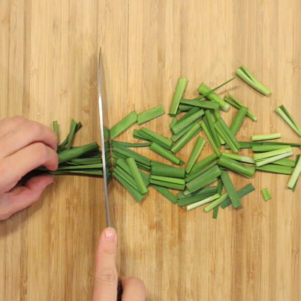 白菜は一口サイズの角切りにする。にらは5cm幅に切り、しいたけはスライスする。