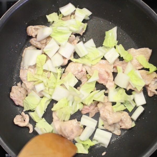 フライパンにごま油をひいて豚小間切れ肉を炒め、焼き色がついてきたら、白菜を加えて炒める。