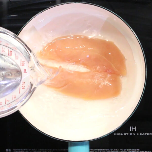 小鍋に鶏ささみを入れ、ささみがかぶる程度の水を入れて火にかける。沸騰したら火を弱め1分程度加熱して火を止める。
