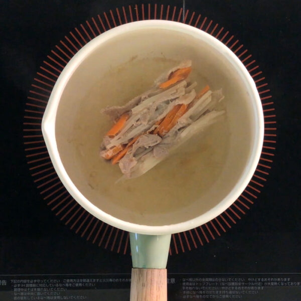 水を加え蓋をし、弱火で加熱する。野菜に火が通ったら、白だしを加える。