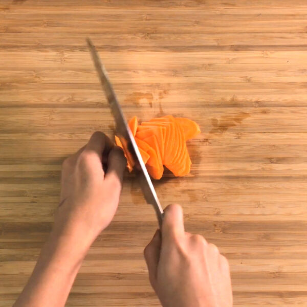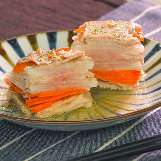 鍋に、だいこん、豚肉を交互に重ね、2回に1度にんじんを重ね入れる。