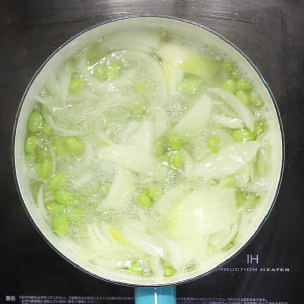えだまめ、1を柔らかくなるまで茹であげる。えだまめは、トッピング用に少量取っておく。
