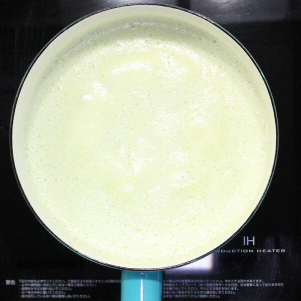 鍋に牛乳、コンソメ、2を入れハンドミキサーにかけてなめらかにする。