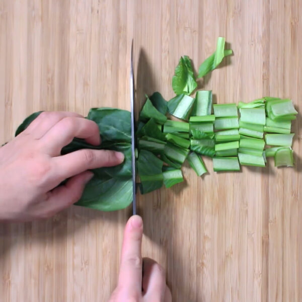 しめじを小房に分け、こまつなは2~3cmの長さに切る。