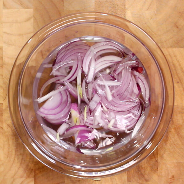 赤たまねぎを2mm幅の薄切りにする。