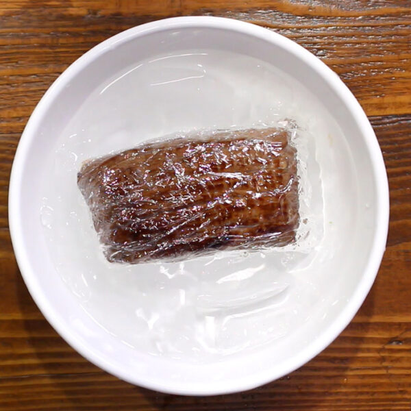 冷めたら、ラップを2~3重にしてお肉を包む。