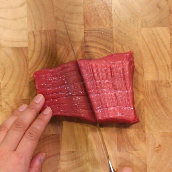 牛肉ブロック全体を、包丁の背で軽くたたく。