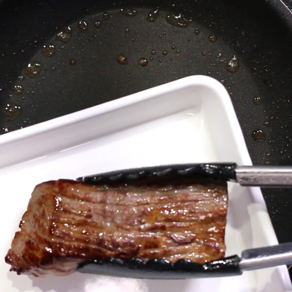 フライパンにサラダ油を入れて、肉の表面全体を焼き色がつくまでしっかりと焼く。