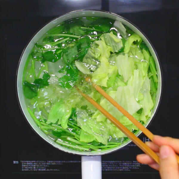 お湯の入っている鍋に1の三つ葉とレタスを入れる。軽くゆでたら、火を弱火にし、三つ葉とレタスがしんなりするまでふたをして、3~4分ほど煮る。