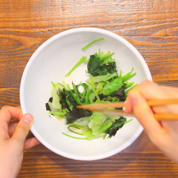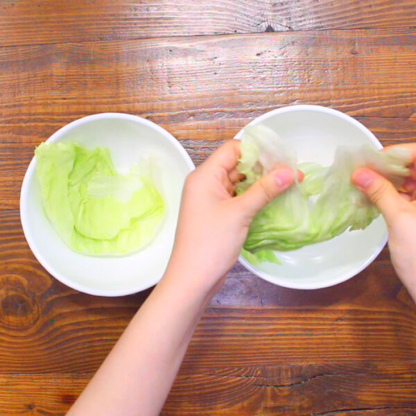 三つ葉は4cm幅に切る。レタスは一口大にちぎり、焼きのりも1cm角にちぎっておく。