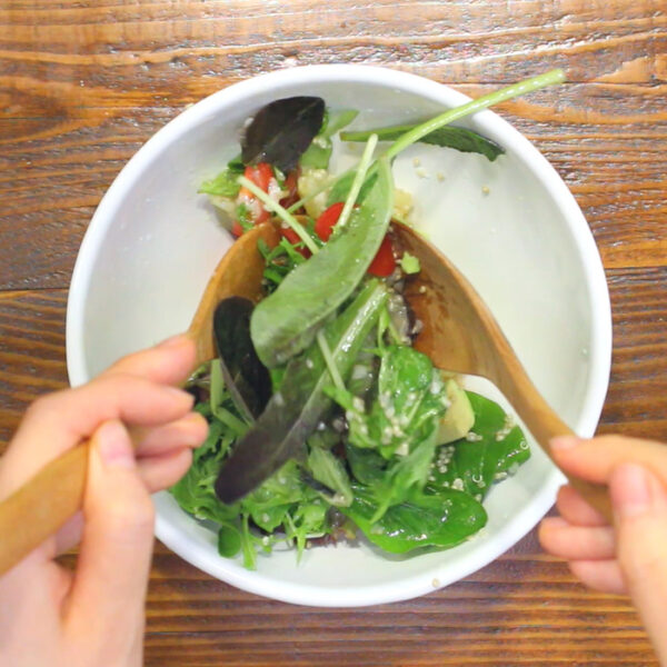ボウルに塩麴とオリーブ油を合わせ、洗って良く水気を切ったベビーリーフ、1、2、3を合わせて馴染ませ、黒胡椒をかける。