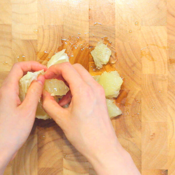 グレープフルーツは皮を剝いて食べやすい大きさにカットし、ミニトマトは1/4にカットする。