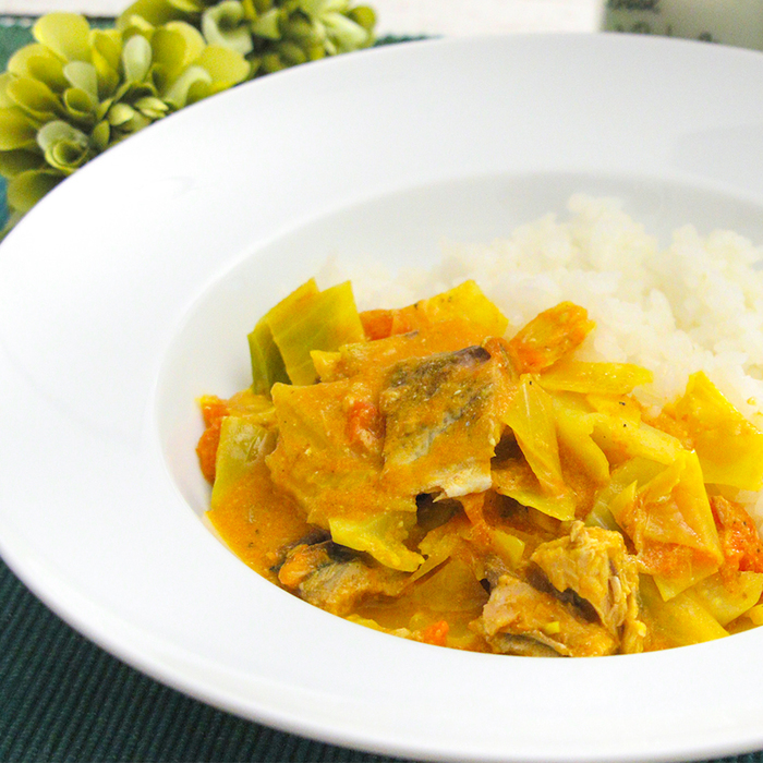 キャベツが柔らかくなったらサバ缶を加えてひと煮たちさせ、火を止めプレーンヨーグルト、塩を加えてよく混ぜる。