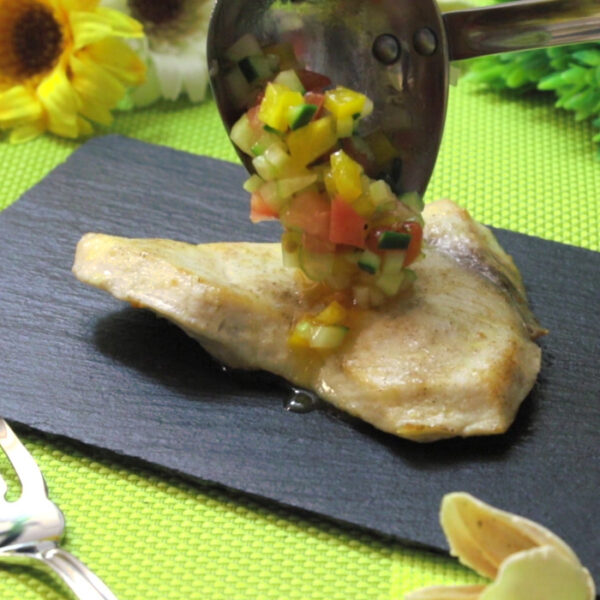 お皿にかじきを盛り付け、上から3のサルサソースをたっぷりかけて完成。