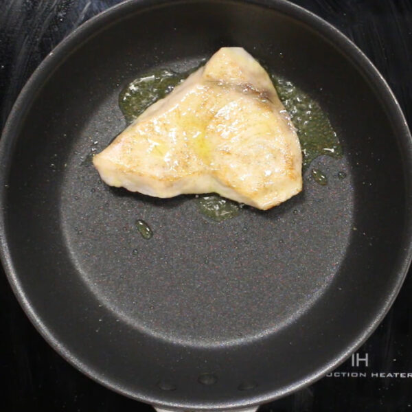 フライパンにオリーブ油を熱し、下味をつけたかじきを焼く。