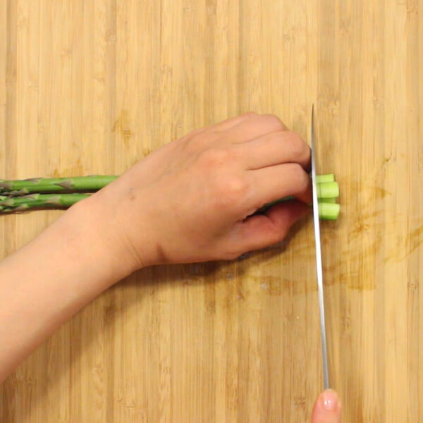 グリーンアスパラは筋を取り除き、1cm幅に切る。