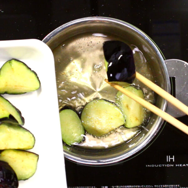 ・なすは高めの温度で揚げる事により、吸油量を抑えます。