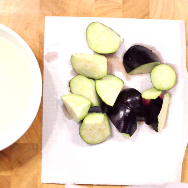 なすは乱切りにする。水にさらしキッチンペーパーで水気を取る。