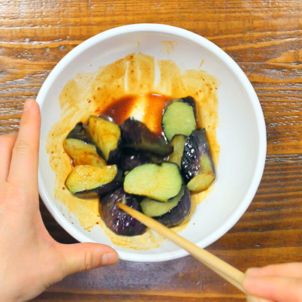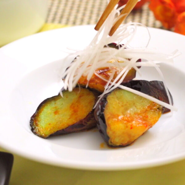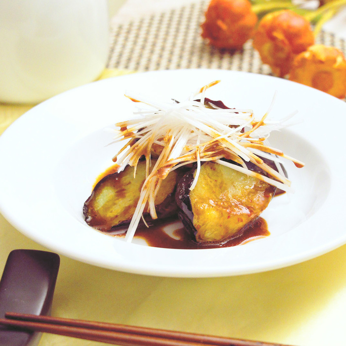 ・油と相性が良い茄子を素揚げにしてピリ辛のソースに絡めたお料理です。