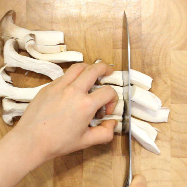エリンギは縦に割き、長いようなら半分の長さに切る。玉ねぎは薄切りにする。
