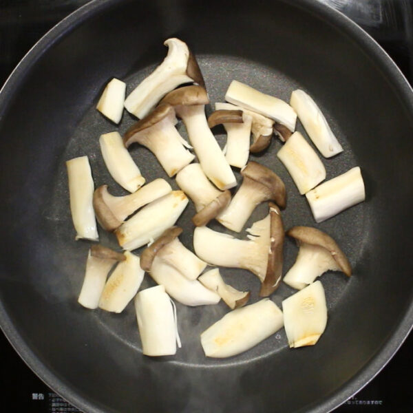 フライパンにエリンギを入れ中火にかけ、焼き色がつくまで炒めて、一度皿に取り出す。