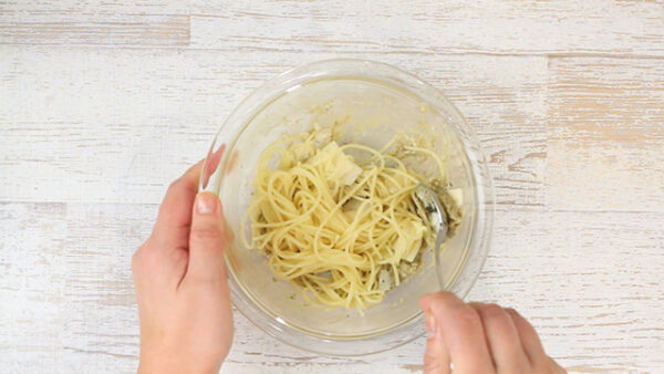 表示時間通りに茹でた熱々のスパゲッティの水気を切ってから3に入れてチーズと絡め合わせる。