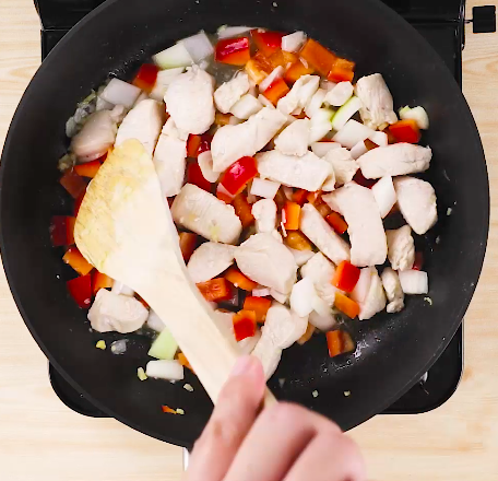 鶏肉の表面が白くなったら、パプリカとたまねぎを加えて更に炒め、鶏肉が中まで加熱されたら調味料Aとナッツを加えて水分がなくなるまで炒めて完成。