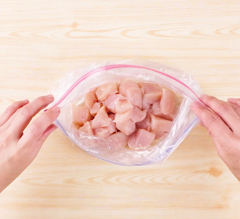 鶏胸肉は2cm角程度の大きさに切り、ポリ袋に入れたら酒と塩を加えて揉み込む。