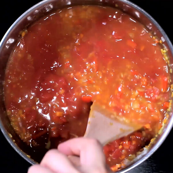 全体がしんなりしてきたら、トマト缶、水を加え水分がなくなるまで弱火で煮詰める。