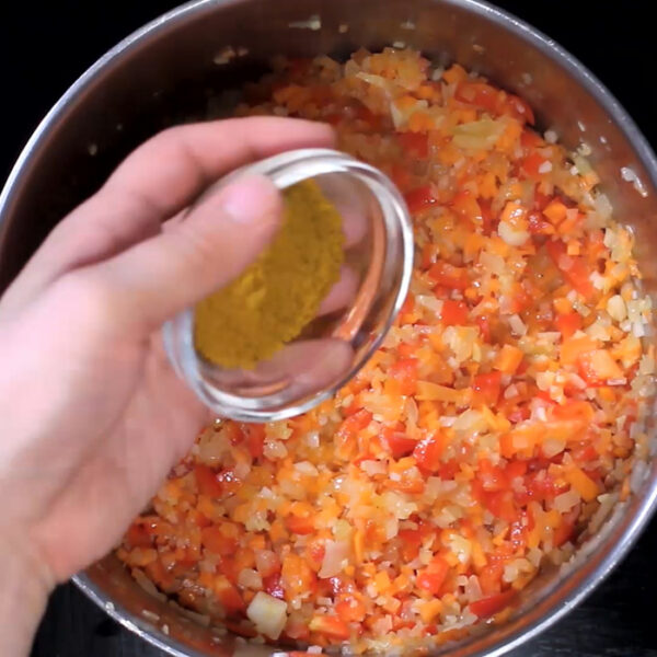 1のにんじん、パプリカを加えて炒め、カレーパウダーを加えてさらに炒める。