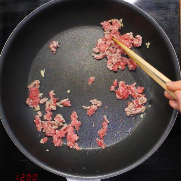 フライパンに油をひかず、ひき肉、しょうがを入れて炒める。