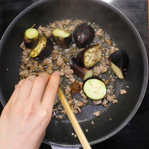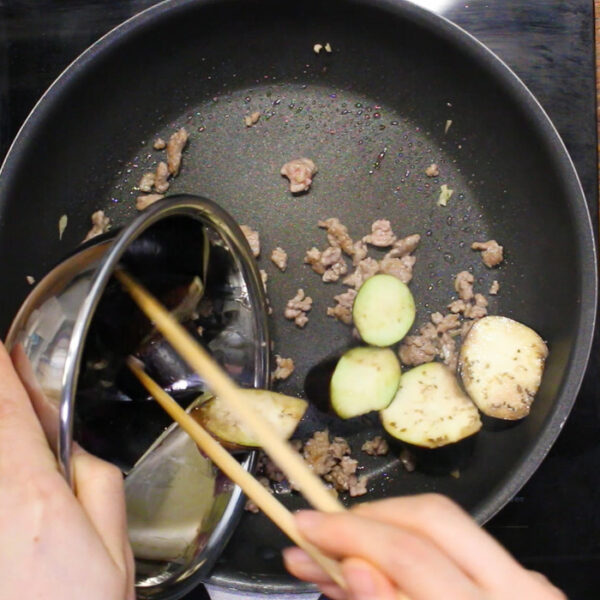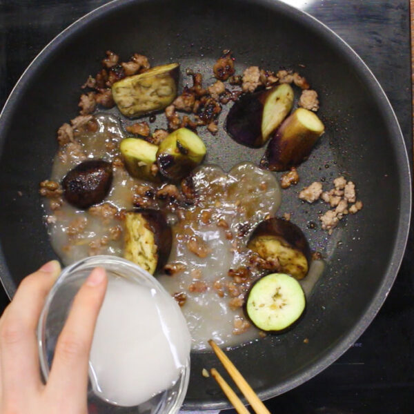 なすが柔らかくなったら、Bを加えてとろみをつける。