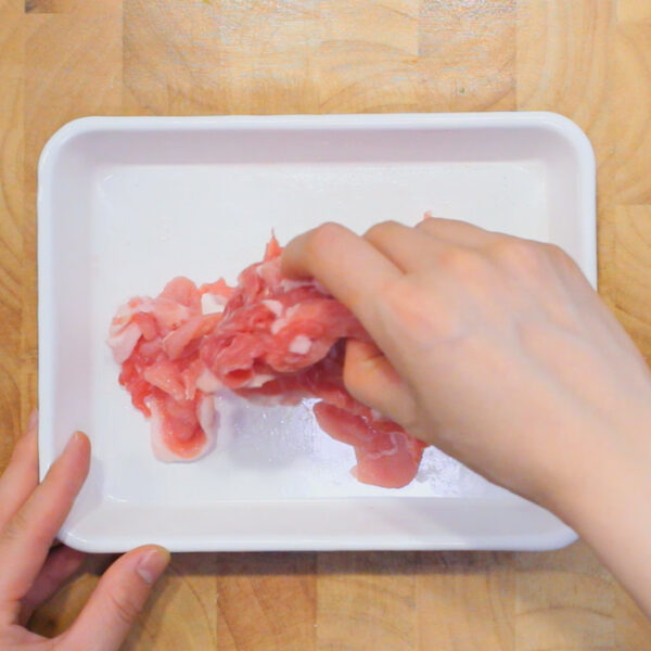 フッ素樹脂加工のフライパンで豚肉を炒め、色が変わったら1の野菜を炒め、皿に盛り付ける。