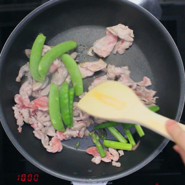 アスパラガスは固いところの皮をむき、4cm幅に切り、きぬさやとスナップエンドウは筋を取っておく。豚肉は塩、こしょうを振っておく。